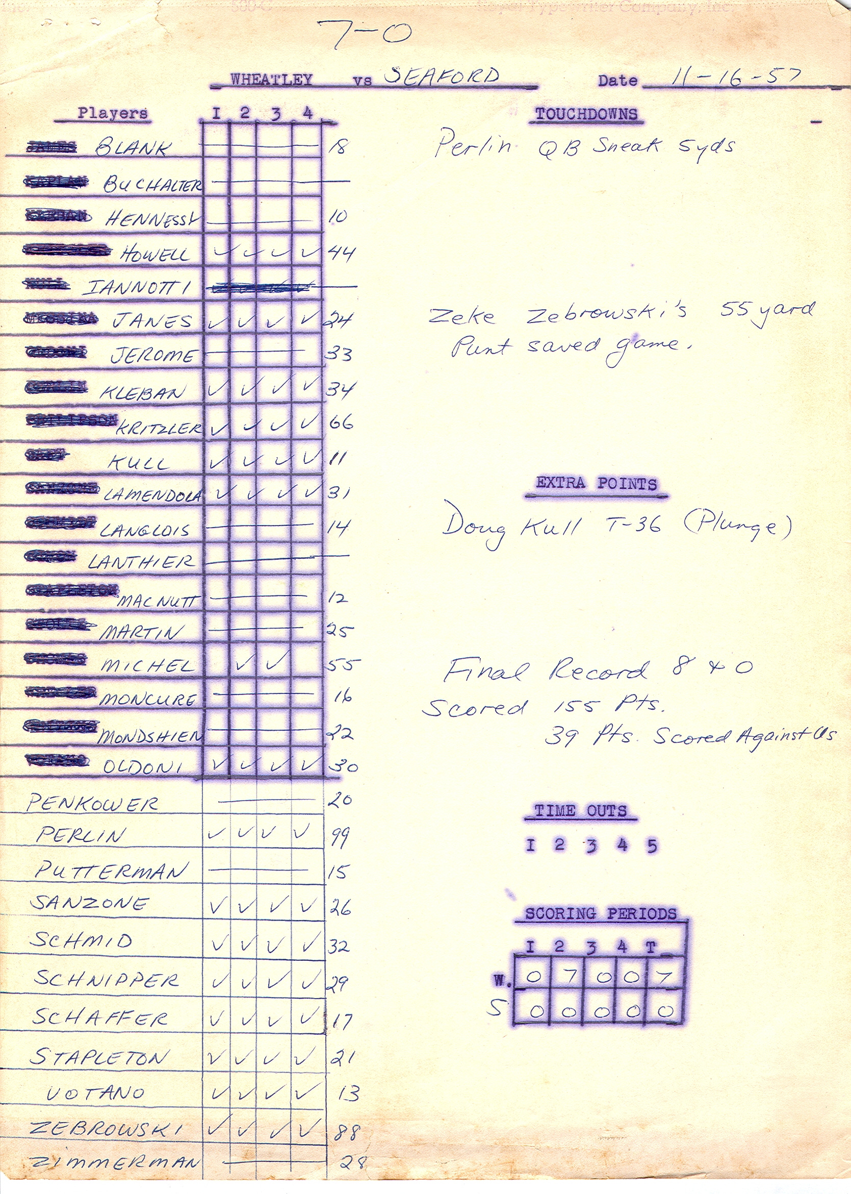 Submitted and explained by Bob Holley (1958) - “Looking over old Wheatley football relics, including the attached game record for Seaford, I came across something that didn’t seem to make sense at first blush: that Doug Kull scored an extra point on a ‘T36 plunge.’ Why wasn’t that a 2-point "extra point"? Because schools did not adopt the 2-point conversion until 1958. It migrated to the pros even later.”