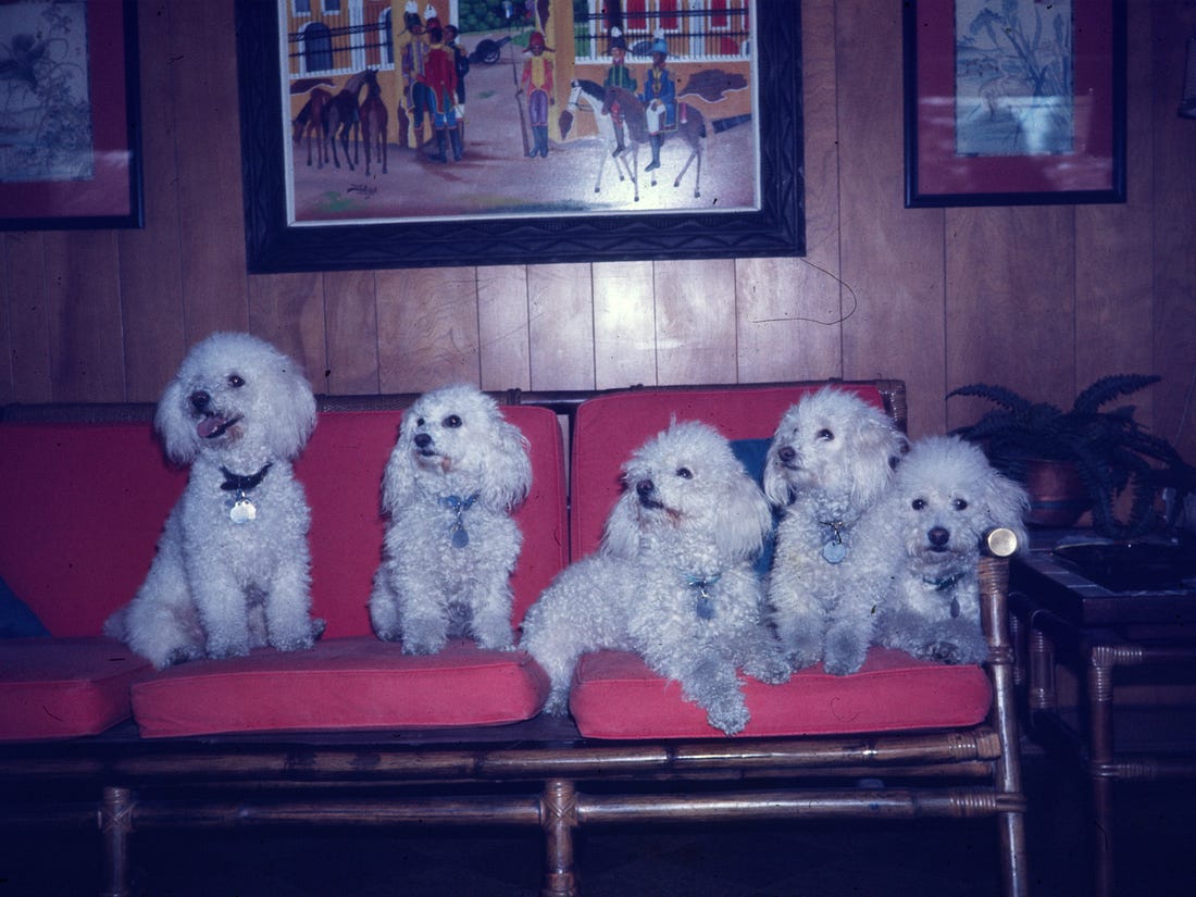 Seraphim, Cocoa, Angel, and Alphie are poodles. Poochie belonged to Howard